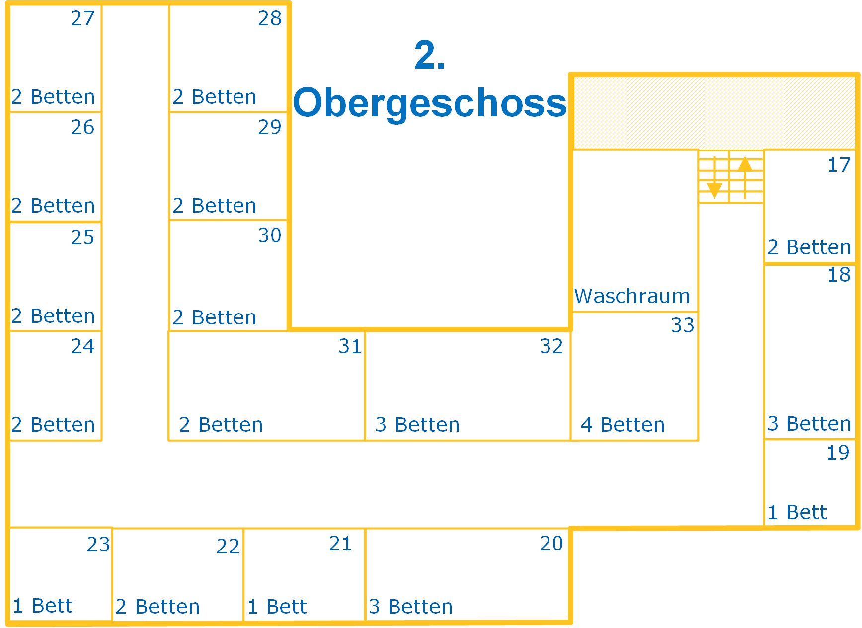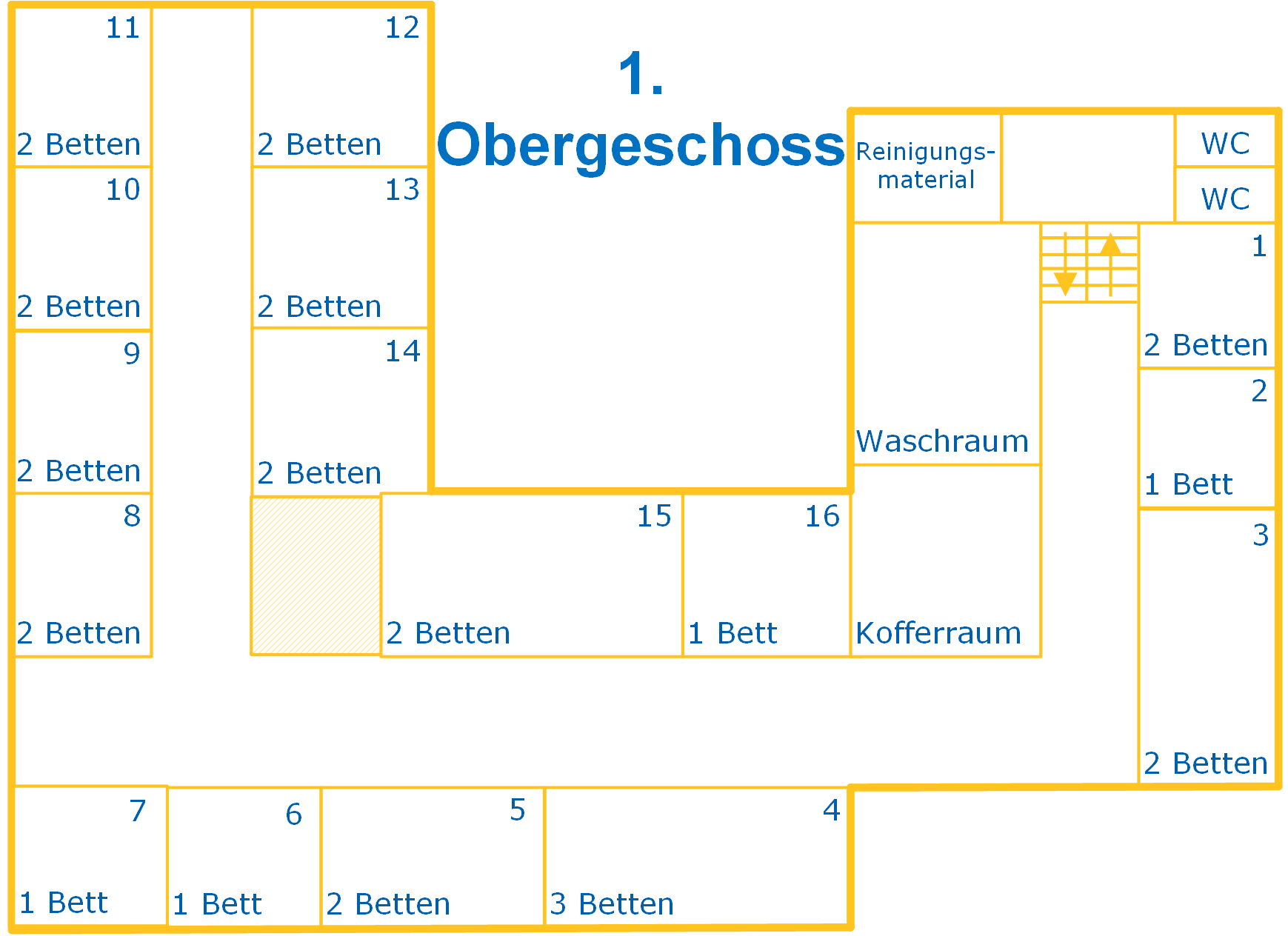 Im Freiämter Ferienhaus finden 77 Personen in 34 Zimmern mit bequemen Betten und einem Matratzenlager mit 12 Plätzen eine guten Nachtruhe. Die Betten sind folgendermassen aufgeteilt: